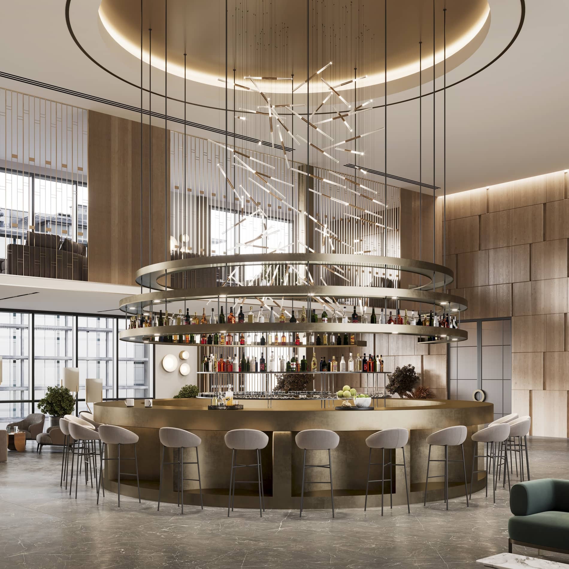 Lobby spacieux avec double hauteur, grandes baies vitrées, bar en bois, salons beiges et lustres circulaires dorés